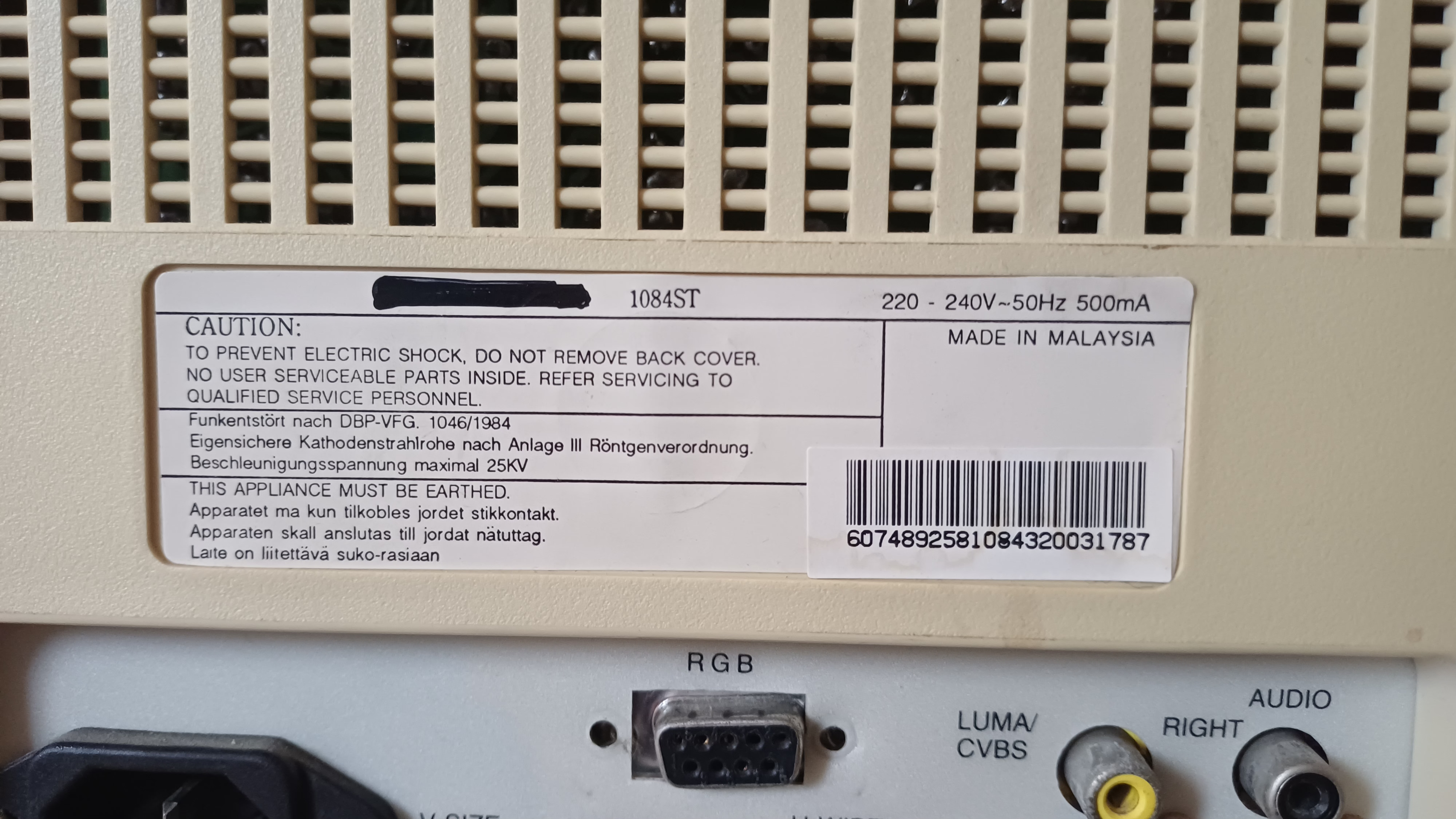 dot pitch: 0.42 mm 1: Some say on the net that the 1084ST has made by Philips. Philips have made all of its monitors in Taiwan that times but this monitor has made in Malaysia. I think it was made by Likom that company established in Malaysia in 1992: http://www.likom.com.my/ProsServ/DP/PS_DP_Capable.asp#1 (on archive.org) The Commodore 1084ST from 1992 (earlier column) uses Philips M34EAQ01X tube, but 1084ST from 1994/5 uses Hitachi M34JDV13X04 tube. www.nerdone.it more pictures see there. ![]() Picture source: eBay.de support CGA/RGBi mode! Earlier backplate label: ![]() This image taken by Marek Later backplate label: ![]() Picture source: eBay.de |